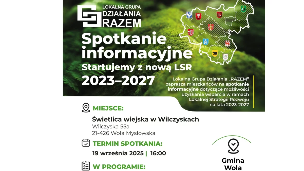 Lokalna Grupa Działania „Razem” prowadzi od kilku tygodni cykl spotkań informacyjnych poświęconych nowej Lokalnej Strategii Rozwoju na lata 2023–2027. Ostatnie z nich zaplanowano na piątek, 19 września 2025 r., o godz. 16:00 w świetlicy wiejskiej w Wilczyskach (Wilczyska 55a, gmina Wola Mysłowska).