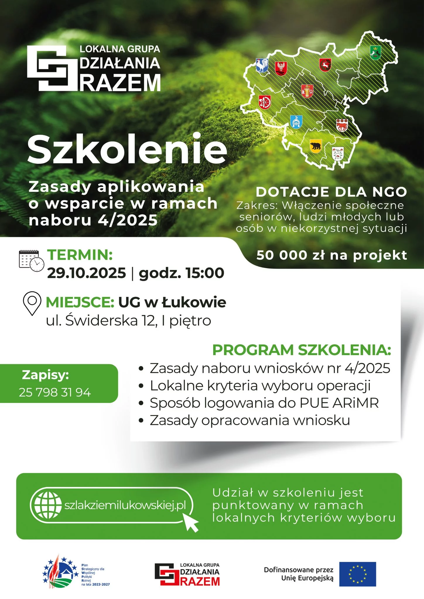 Więcej informacji o planowanym naborze: [przejdź do strony] https://szlakziemilukowskiej.pl/aktualnoscii?fbclid=IwY2xjawNe4FVleHRuA2FlbQIxMABicmlkETBKREc5YWcxMGdINDBpTmswAR6nT35nuG6cZPql3KhrhBnGBJ1j-5PQ487HEQv7yR3jZzBKW3u87juKuJTE2g_aem_IetI_fSah45b-5bGqoqKyg