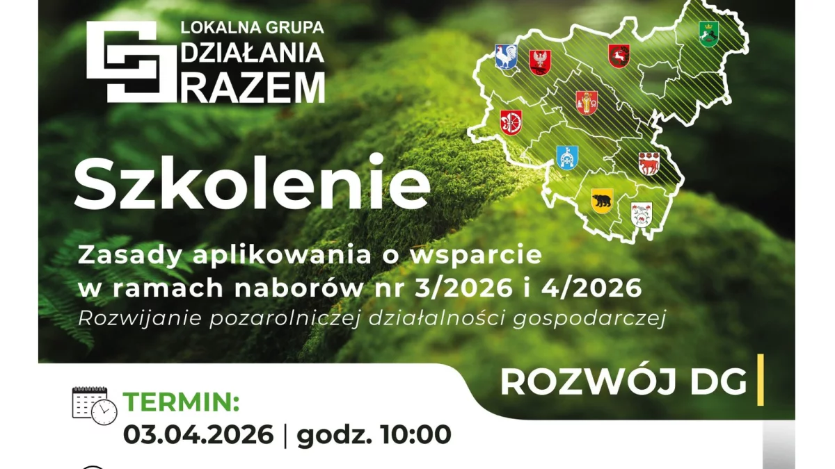 Lokalna Grupa Działania „RAZEM” zaprasza na szkolenie „Zasady aplikowania o wsparcie w ramach naborów nr 3/2026 i 4/2026”, poświęcone planowanym w maju 2026 naborom wniosków z zakresu ROZWÓJ DG - Rozwijanie pozarolniczej działalności gospodarczej.