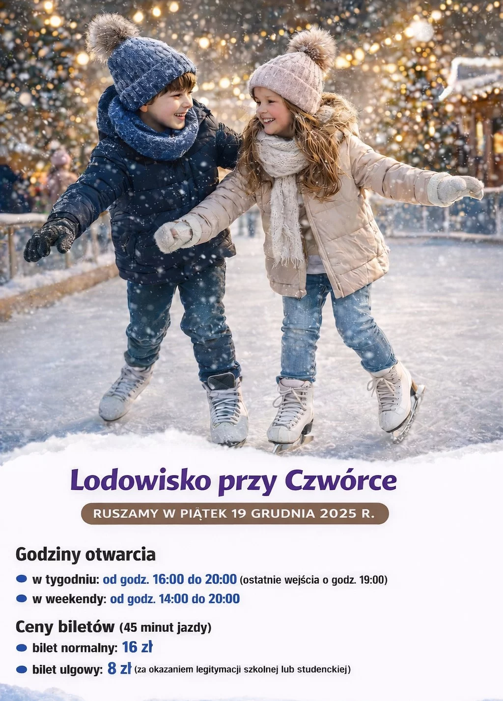 Obiekt będzie czynny zarówno w tygodniu, jak i w weekendy, dzięki czemu każdy znajdzie dogodny czas na jazdę na łyżwach.