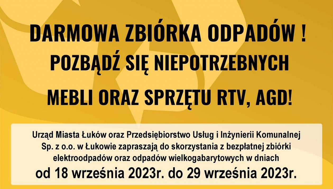Bezpłatna zbiórka elektroodpadów oraz odpadów wielkogabarytowych to cykliczna akcja organizowana przez PUIK w Łukowie oraz Urząd Miasta. Zużyty sprzęt RTV i AGD, a także odpady wielkogabarytowe, takie jak np. meble, dywany, będą odbierane z nieruchomości mieszkańców miasta tylko po wcześniejszym zgłoszeniu telefonicznym lub osobistym w Urzędzie Miasta Łuków w Referacie Gospodarki Odpadami Komunalnymi (parter budynku, pokoje nr 15 i 16), bądź w PUIK.