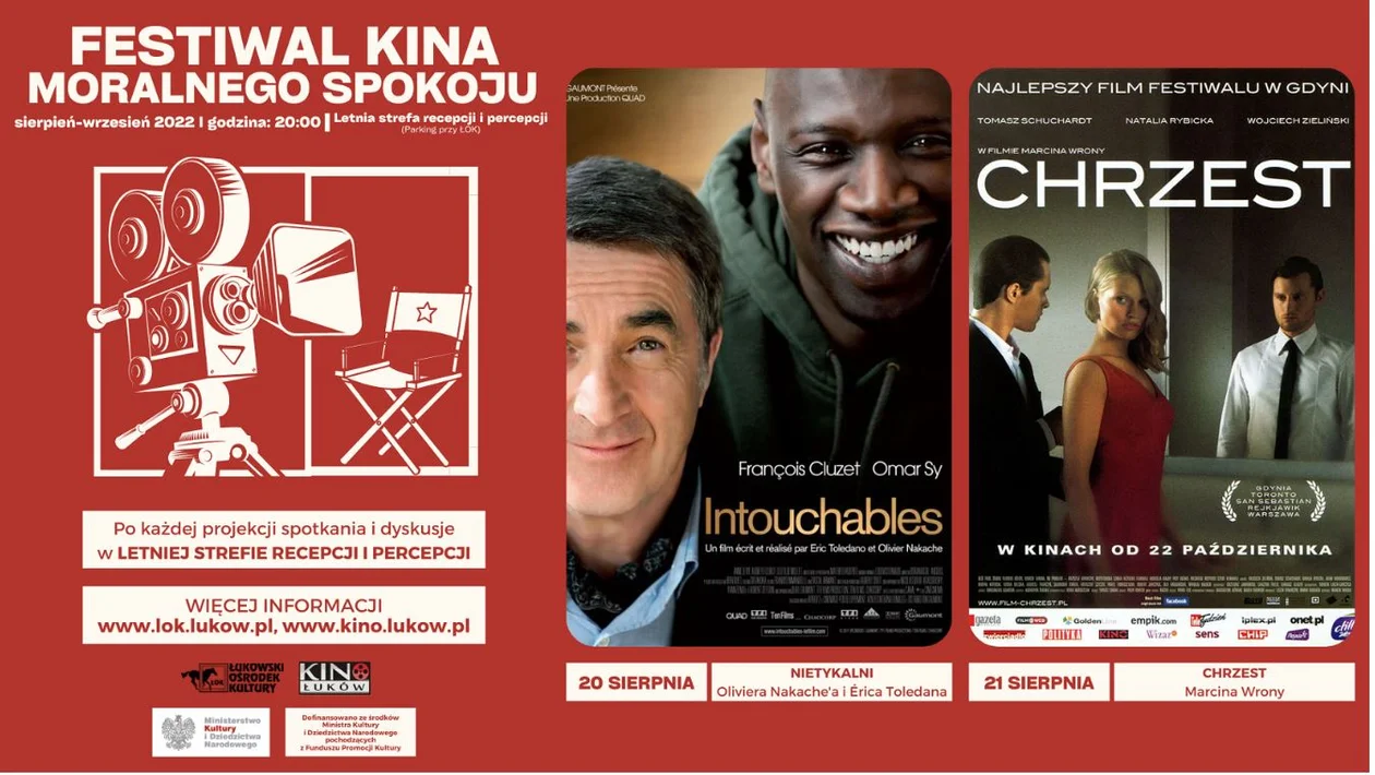 - sobota 20.08.2022 godz. 20:00 - „Nietykalni”. Film biograficzny produkcji francuskiej w reżyserii Oliviera Nakache'a i ÉricaToledana. Ta historia zdarzyła się naprawdę. Sparaliżowany na skutek wypadku milioner zatrudnia do pomocy i opieki młodego chłopaka z przedmieścia, który właśnie wyszedł z więzienia. Zderzenie dwóch skrajnie różnych światów daje początek szeregowi niewiarygodnych przygód i przyjaźni, która czyni ich... nietykalnymi.