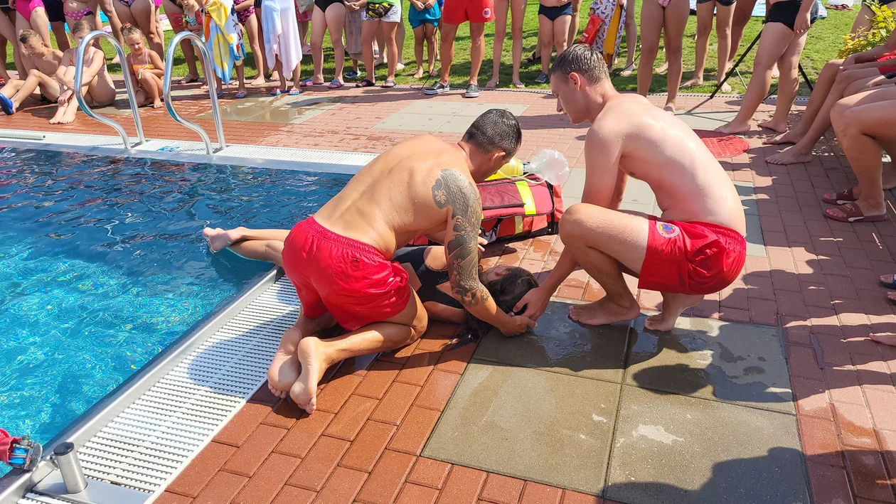 Pracujący na basenach ratownicy pokazali, jak przeprowadzają akcję ratunkową, kiedy ktoś tonie. To była cenna lekcja dla osób wypoczywających na Pływalni Letniej Delfin.