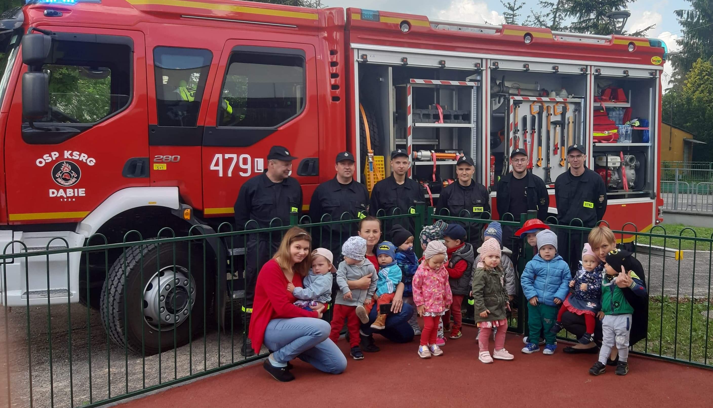 Strażacy z OSP Dąbie gościli w Żłobku Miejskim w Łukowie. Pokazali dzieciom na czym polega ich praca. Każdy Maluszek mógł poczuć się jak prawdziwy druh lejąc "sikawką" i siedząc za kierownicą strażackiego wozu.