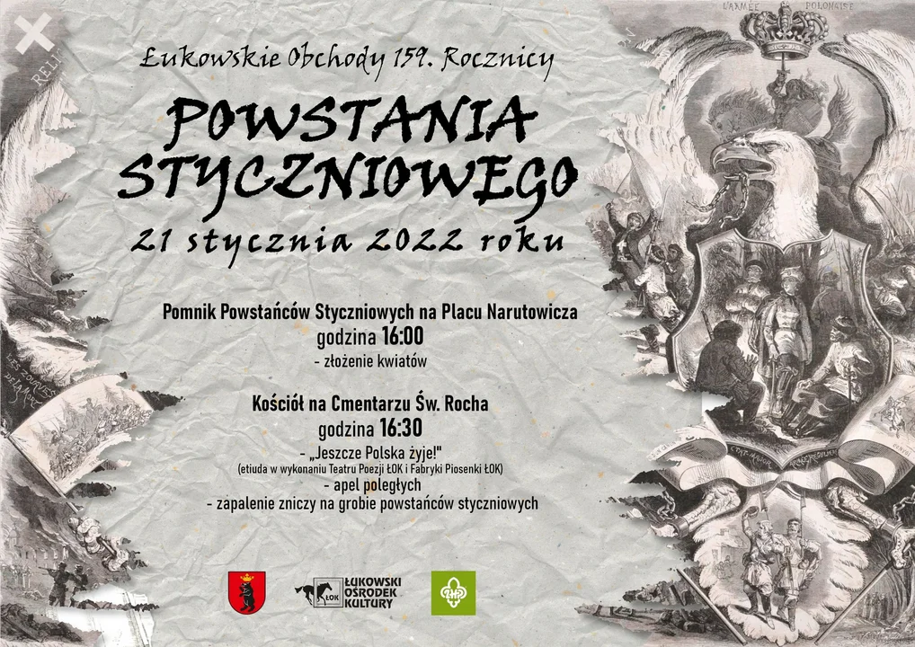 Powstanie Styczniowe było największe polskim powstaniem narodowym. Było skierowane przeciwko Imperium Rosyjskiemu. Zostało ogłoszone Manifestem 22 stycznia 1863 roku, wydanym w Warszawie przez Tymczasowy Rząd Narodowy. Wybuchło 22 stycznia 1863 roku w Królestwie Polskim i 1 lutego 1863 roku na Litwie. Trwało do jesieni 1864 roku. Miało ono charakter wojny partyzanckiej, w której stoczono ok. 1200 bitew i potyczek. Przez oddziały powstania styczniowego przewinęło się około 200 tys. ludzi. Mimo początkowych sukcesów zakończyło się klęską powstańców, z których kilkadziesiąt tysięcy zostało zabitych w walkach, blisko 1 tys. straconych, ok. 38 tys. skazanych na katorgę lub zesłanych na Syberię, a ok. 10 tys. wyemigrowało. Zdarzały się przypadki, że Rosjanie zabijali pojmanych powstańców, dobijali rannych, mordowali lekarzy spieszących im z pomocą, obdzierali do naga zabitych. Po bitwach Rosjanie palili miejscowości, które udzieliły schronienia powstańcom, dokonywali rzezi ludności cywilnej. Niszczono dobra kultury. Przypominamy, że wielu młodych łukowian zaciągnęło się do oddziałów powstańczych, które na początku toczyły z zaborcą rosyjskim duże bitwy, rzucając do walk setki, a nawet tysiące ludzi.