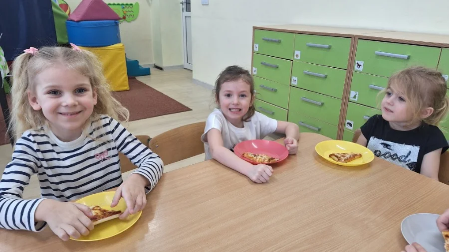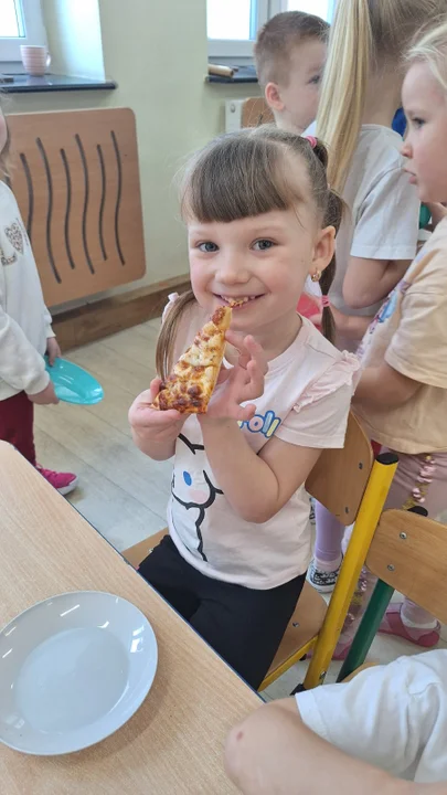 W części praktycznej dzieci samodzielnie wykonywały kolejne czynności technologiczne: rozprowadzały sos na cieście, układały wybrane składniki oraz posypywały całość serem. Następnie przygotowane porcje zostały poddane wypiekowi.