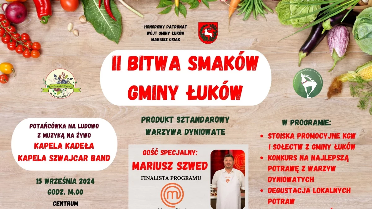 Wydarzenie, o którym mowa to "Bitwa Smaków Gminy Łuków". Będzie to druga edycja imprezy, a odbędzie się ona w niedzielę 15 września o godz. 14:00 w Centrum Etnograficzno - Wypoczynkowym w Kownatkach.