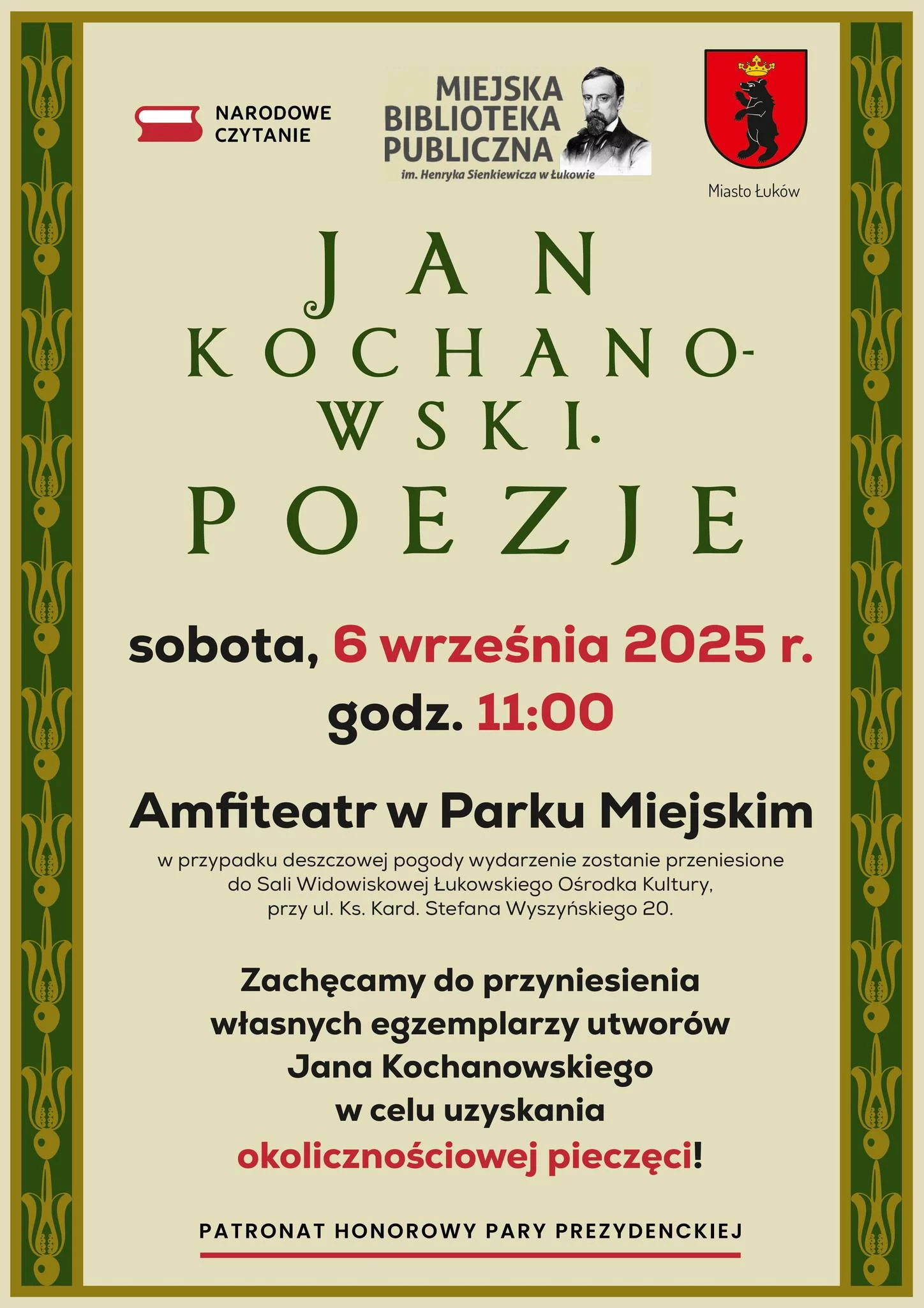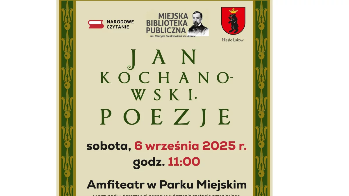 Wydarzenie odbędzie się w sobotę, 6 września 2025 roku o godz. 11:00 w amfiteatrze w Parku Miejskim w Łukowie. W przypadku niekorzystnych warunków pogodowych czytanie zostanie przeniesione do Sali Widowiskowej Łukowskiego Ośrodka Kultury przy ul. Ks. Kard. Stefana Wyszyńskiego 20.