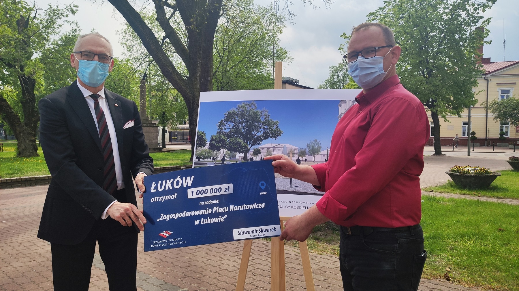 W miejscu tym przekazany został symboliczny czek na kwotę miliona złotych na zadanie inwestycyjne związane z modernizacją historycznego miejsca w centrum miasta. Środki „wręczył” burmistrzowi Łukowa Piotrowi Płudowskiemu Poseł na Sejm RP Sławomir Skwarek.