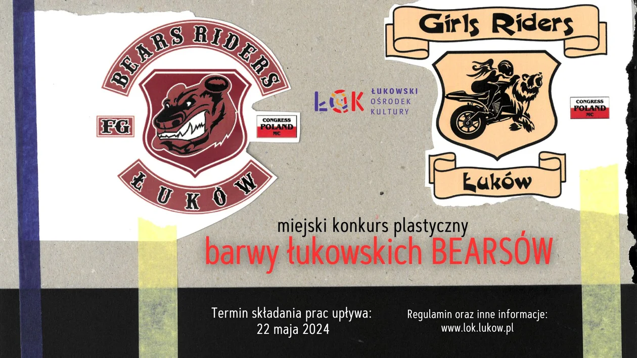 Łukowski Ośrodek Kultury, Girls Riders Łuków i Bears Riders Łuków serdecznie zapraszają dzieci w wieku od 5 do 12 lat do udziału w miejskim konkursie plastycznym „Barwy łukowskich BEARSÓW”. Prace będą oceniane w trzech kategoriach wiekowych: 5-7 lat, 8-10 lat oraz 11-12 lat. Technika wykonania prac: malarska i rysunkowa. Format prac: A4.