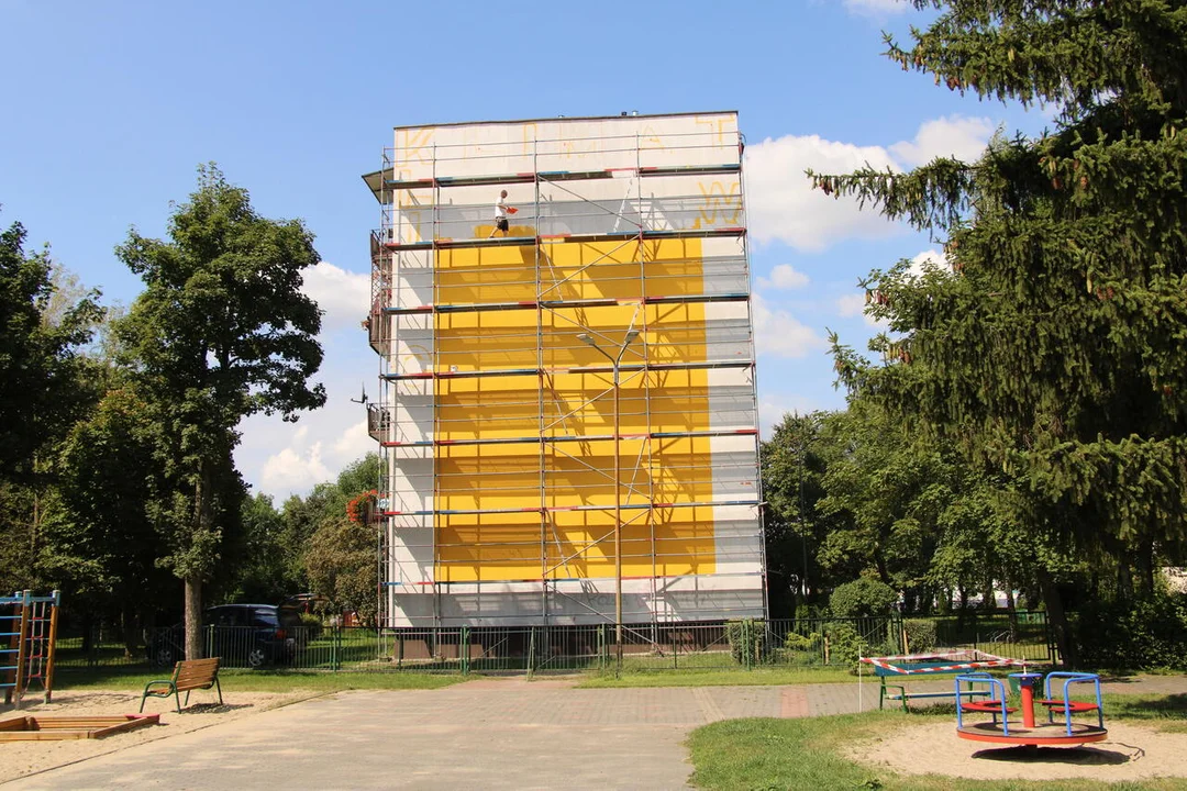 Mural jest wykonywany w technice szablonowej. Adam Kopeć wszedł na ścianę we wtorek, 22 sierpnia. Dzieło ma być skończone jeszcze w tym tygodniu.