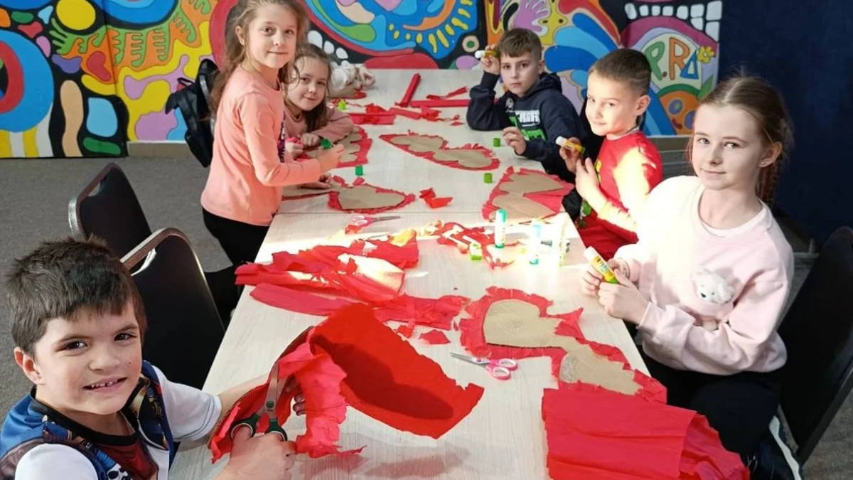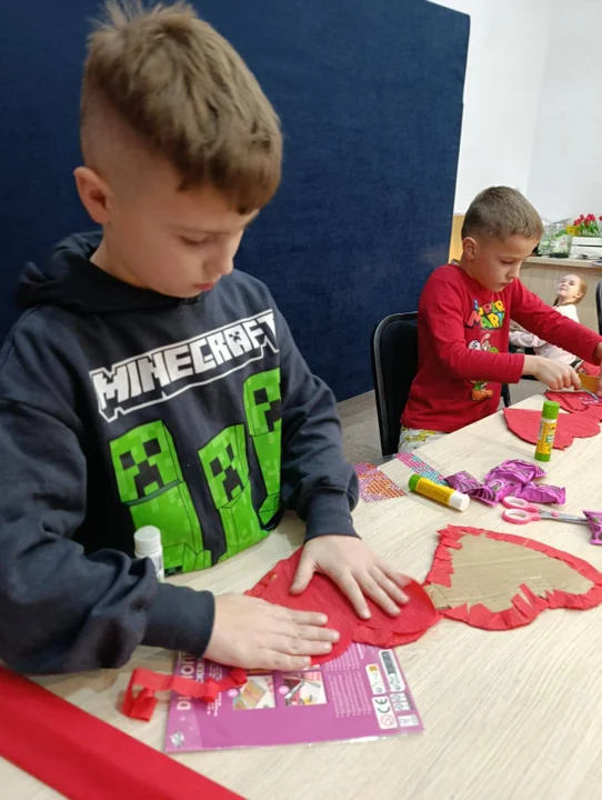 Młodzi uczestnicy z dużym zaangażowaniem przygotowywali ozdobne serca, które wypełniali własnoręcznie napisanymi życzeniami dla bliskich osób.