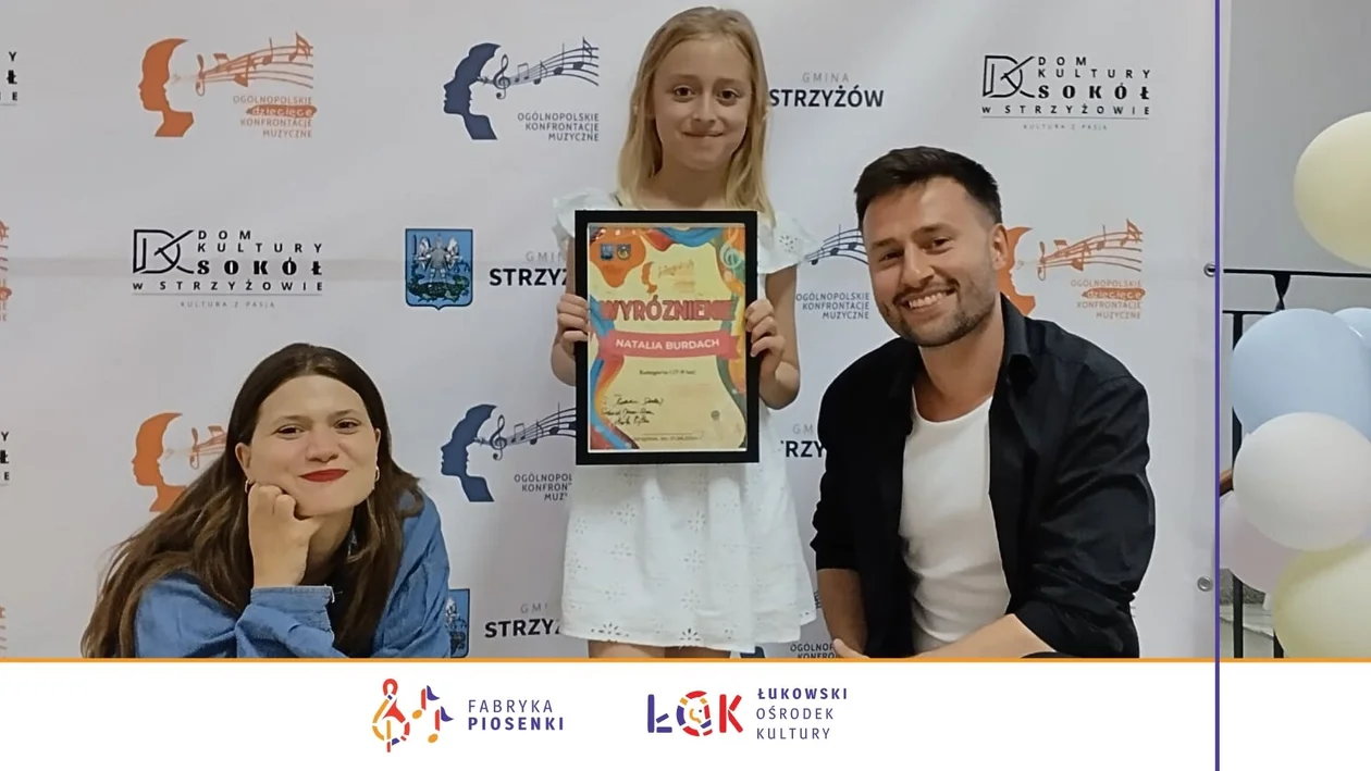 Natalia Burdach otrzymała wyróżnienie na I Ogólnopolskich Dziecięcych Konfrontacjach Muzycznych Strzyżów 2024. Przesłuchania odbyły się 31 maja 2024 roku. Natalia jest jedną z najmłodszych wokalistek Łukowskiego Ośrodka Kultury i po raz kolejny z sukcesem zaprezentowała się na ogólnopolskim konkursie. Gratulujemy! Ogólnopolski Festiwal Piosenki skierowany był do dzieci z całego kraju w wieku od 7 do 15 lat. Wystąpili młodzi wokaliści z całej Polski m.in. z Łukowa, Krakowa, Lublina, Warszawy, Zakopanego, Rzeszowa czy Wejherowa.