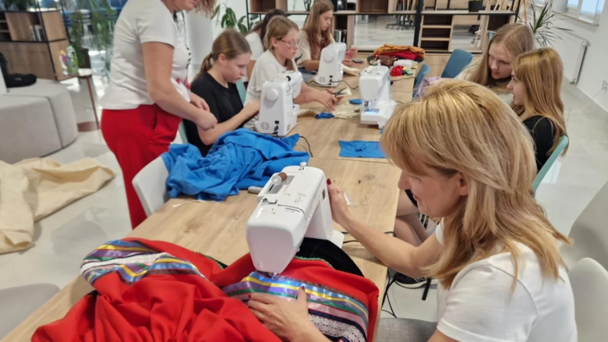 Warsztaty z obsługi maszyn do szycia oraz podstawowych technik krawieckich pozwoliły uczestnikom na zaprojektowanie własnych elementów inspirowanych strojami ludowymi. Zdjęcia archiwalne prezentujące młode dziewczyny z terenu gminy ubranych w wojcieszkowski strój ludowy posłużyły jako materiał inspiracyjny do dalszych działań.