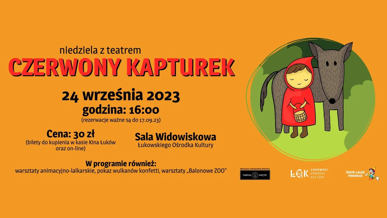 Bilety na spektakl teatralny „Czerwony kapturek" w cenie 30 zł do nabycia są w kasie Kina Łuków oraz on-line