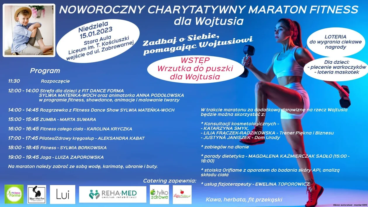 Na maraton należy zabrać ze sobą wodę, karimatę, ubranie sportowe i buty. W trakcie maratonu za dodatkową darowiznę na rzecz Wojtusia będzie można skorzystać z: - konsultacji kosmetologicznych, zabiegów na dłonie, porad dietetyka, usług fizjoterapeuty, zrobić analizę składu ciała. Kawa, herbata, fit przekąski.