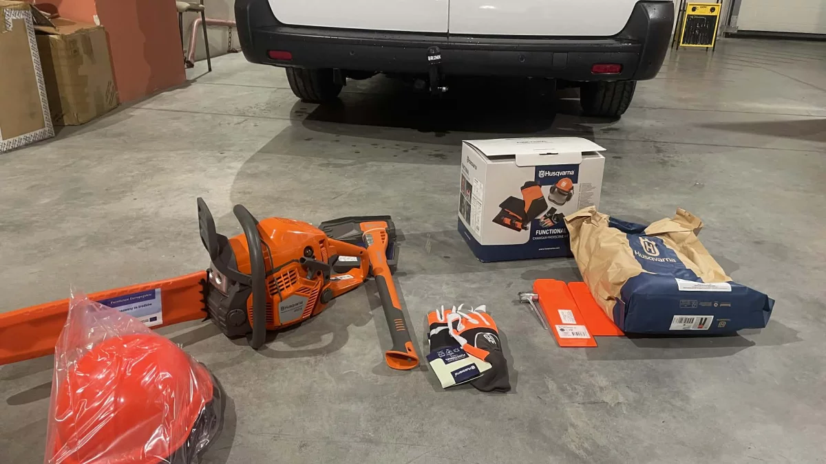 W skład zestawu wchodzą m.in. piła spalinowa, rękawice ochronne, spodnie pilarza, hełm ochronny z okularami i ochroną słuchu, siekiera rozłupująca oraz zestaw klinów.