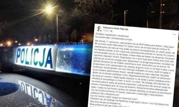 "Zostałam napadnięta i okradziona! Ku przestrodze! Udostępniajcie proszę. We wtorek 11 czerwca br. zatrzymałam się na MOP Markuszów Północ, stacji paliw BP na trasie Lublin-Warszawa S17, byłam sama, ale nie było jeszcze ciemno. Po zatankowaniu do kasy za mną udało się dwóch obcokrajowców, po chwili wyszli. Jak się okazało później, w tym czasie przy dystrybutorze przecięli mi oponę."