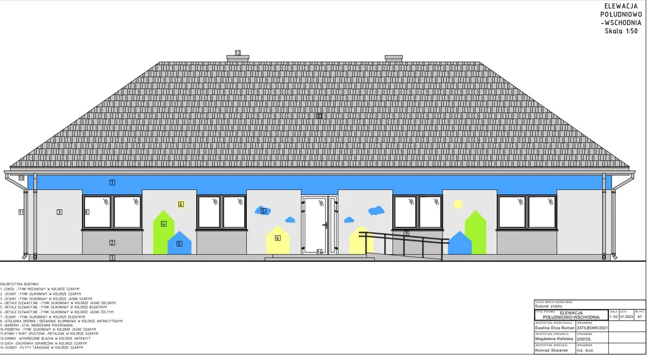 Budynek żłobka zaprojektowano jako parterowy z poddaszem nieużytkowym. Ma wymiary 10,60m x 23,40m, z dachem wielospadowym, krytym dachówką ceramiczną. Na parterze znajduje się wiatrołap, komunikacja, szatnia, oddział żłobkowy, pomieszczenie socjalne, rozdzielnia posiłków, zmywalnia, pomieszczenie techniczne, łazienka, drugi oddział żłobkowy, wc dla niepełnosprawnych oraz pomieszczenie biurowe. Ściany wykończone tynkiem cienkowarstwowym o zróżnicowanej kolorystyce w odcieniach szarości z detalami w kolorze żółtym, błękitnym oraz zielonym. Budynek posiada dwie sale (oddziały żłobkowe) w każdej z sal do 19 dzieci. Dostęp dla osób niepełnosprawnych poprzez wykonanie pochylni przy wejściu do budynku, pomieszczenia przystosowane są dla osób niepełnosprawnych.
