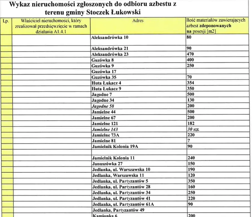W załączniku do niniejszej informacji znajduje się wykaz nieruchomości zgłoszonych dotychczas przez mieszkańców do odbioru wyrobów zawierających azbest.