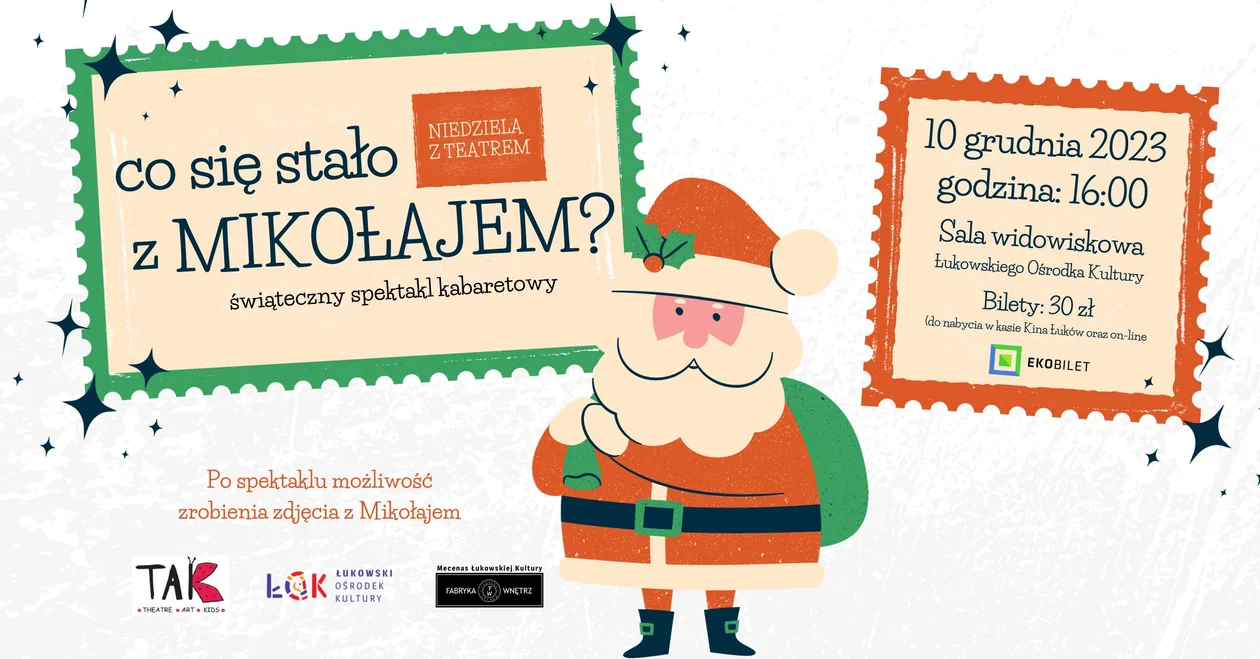 Informacje łukowskieŁukowski Ośrodek Kultury zaprasza na mikołajkowy spektakl teatralny dla dzieci pt. „Co się stało z Mikołajem?". Przedstawienie w wykonaniu Teatru TAK odbędzie się w niedzielę 10 grudnia o godz. 16:00 w sali widowiskowej ŁOK. To kolejne wydarzenie w ramach cyklu „Niedziela z teatrem".