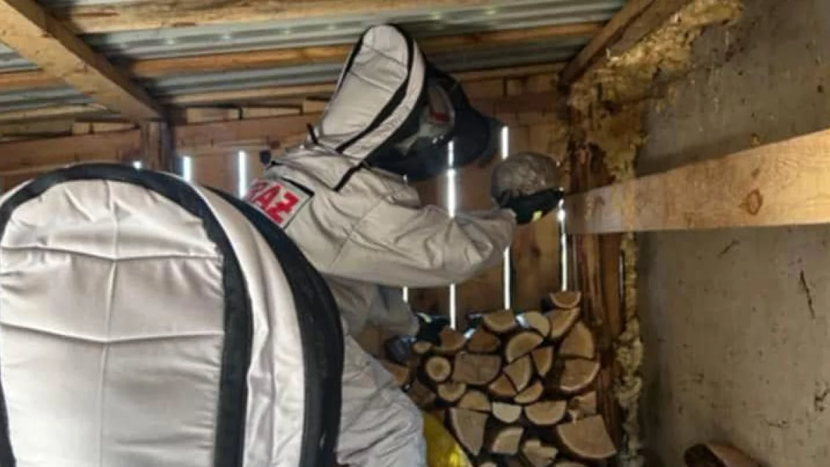 Strażacy, wyposażeni w specjalne kombinezony ochronne, usunęli dużych rozmiarów gniazdo z pomieszczenia.