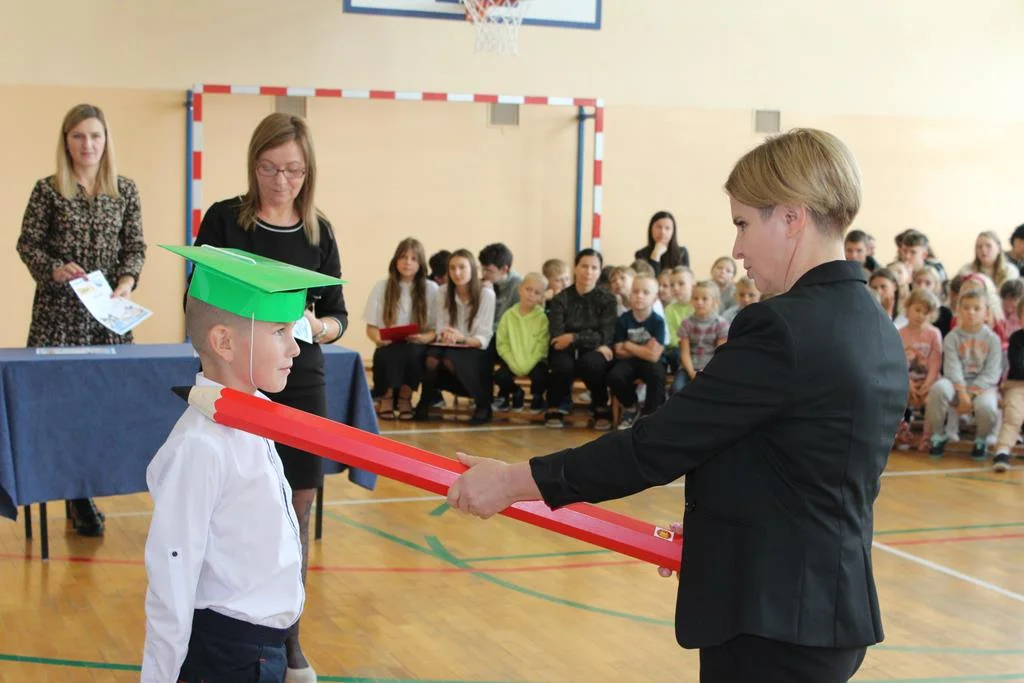 Specjalne podziękowania za nieustanną troskę i bezgraniczną miłość uczniowie pierwszej klasy złożyli na ręce swoich Rodziców, dedykując im żywiołowy taniec "Klepany". Następnie głos zabrała dyrektor Renata Pawlikowska. Doceniła wspaniałą prezentację pierwszoklasistów i stwierdziła, że z wielką radością cała społeczność szkolna przyjmie 15-osobową gromadkę do grona uczniów szkoły. Po odśpiewaniu hymnu państwowego i złożeniu uroczystego ślubowania w asyście pocztu sztandarowego, dyrektor Pawlikowska dokonała pasowania każdego pierwszaka na ucznia. Z rąk wychowawczyni Renaty Zabłockiej - dzieci odebrały pamiątkowe dyplomy. Zgodnie z tradycją na tę okoliczność pierwszaki zostały obdarowane prezentami od rodziców oraz starszych kolegów z klasy II i klasy III. Dyrektor szkoły, wychowawczyni oraz przedstawiciele samorządu uczniowskiego złożyli pierwszoklasistom serdeczne życzenia. Na zakończenie uroczystości uczniowie przechodzili przez czarodziejskie koło z napisem "Udanego startu", które wróży przechodzenie z klasy do klasy i sukcesy w nauce.