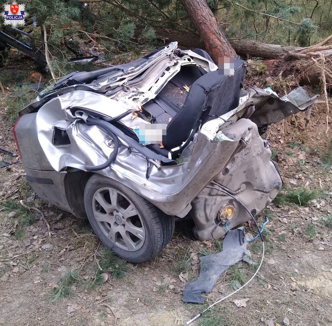 Pracujący na miejscu wypadku policjanci ustalili, że młodzieniec jadący skodą najprawdopodobniej poruszał się z nadmierną prędkością i stracił panowanie nad kierowanym autem. Jadący z dużą prędkością samochód zjechał z jezdni i uderzył w jedno z drzew pobliskiego lasu. Siła uderzenia była tak duża, że skoda rozpadła się na dwie części.