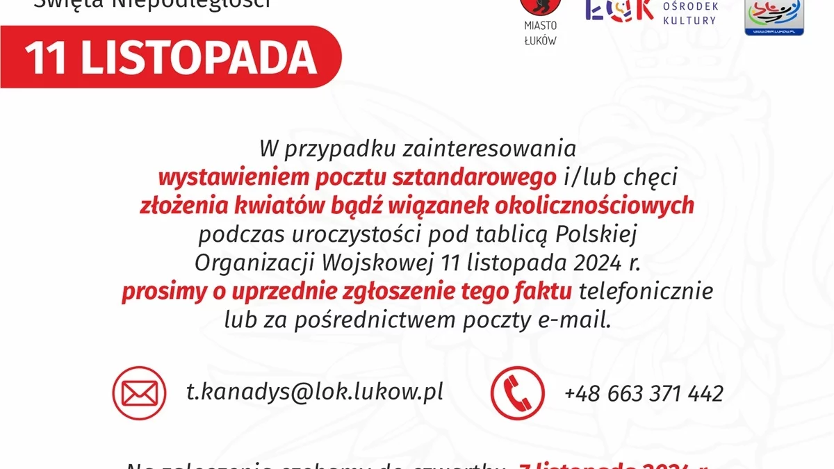 Podmioty oraz osoby fizyczne, które są zainteresowane złożeniem okolicznościowych kwiatów lub wiązanek, a także wystawieniem pocztów sztandarowych podczas zbliżających się uroczystości, proszone są o uprzedni kontakt w tej sprawie z Łukowskim Ośrodkiem Kultury. Prośba kierowana jest m.in. do przedstawicieli jednostek oraz służb, jak również organizacji społecznych, partii politycznych, szkół, zakładów pracy oraz wszystkich osób fizycznych chcących uczcić w ten sposób odzyskanie przez Polskę niepodległości.