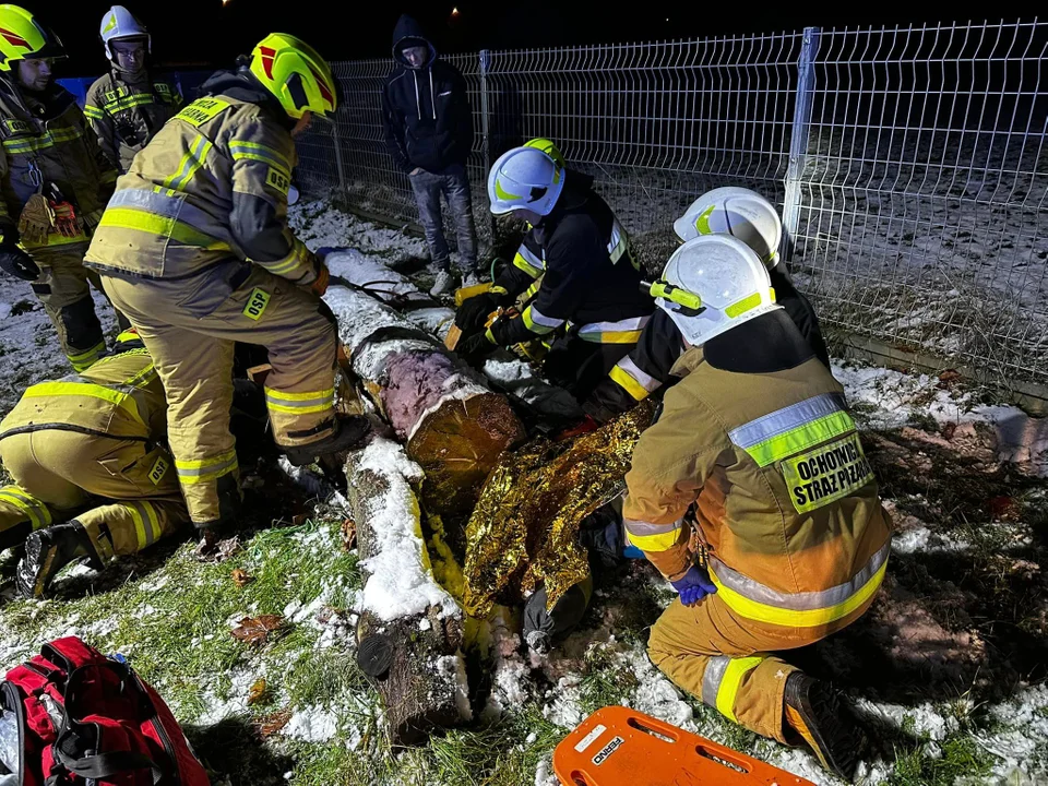W drugim scenariuszu strażacy musieli szybko zareagować na sytuację, w której osoba prowadząca wycinkę drzewa ucierpiała w wyniku upadku drewna. Poszkodowany miał obrażenia nóg i miednicy. Działania podjęte na miejscu obejmowały skuteczny dojazd, prawidłowe ustawienie pojazdu, efektywną komunikację z Kierownikiem Operacji Ratowniczych, zabezpieczenie obszaru zdarzenia, a także precyzyjne rozpoznanie wstępne i szczegółowe, włączając w to udzielanie pomocy przedmedycznej i skomplikowanej ewakuacji.