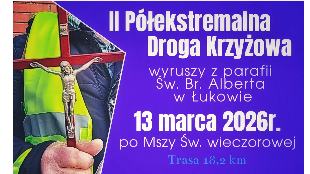 Droga Krzyżowa rozpocznie się po wieczornej Mszy Świętej w kościele św. Brata Alberta w Łukowie. Trasa będzie miała około 18,2 kilometra i poprowadzi m.in. ulicami Kiernickich i Glinki, a także przez Podgaj, Jeziory, Gołąbki oraz tzw. Krężnicę. Marsz zakończy się ponownie przy świątyni.