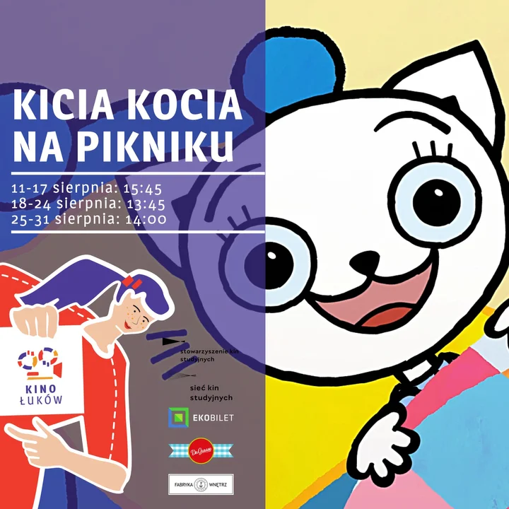 Na film zapraszamy osoby indywidualnie oraz grupy zorganizowane, które mogą zamówić specjalny seans w dogodnym dla siebie terminie. Bajka przeznaczona jest dla dzieci od 4 lat i może być ich pierwszym filmem w kinie. Film „Kicia Kocia na pikniku" będzie wyświetlany w Kinie Łuków w dniach od 11 do 17 sierpnia 2023r. o godz. 15:45 oraz w dniach od 18 do 24 sierpnia 2023r. o godz. 13:45.