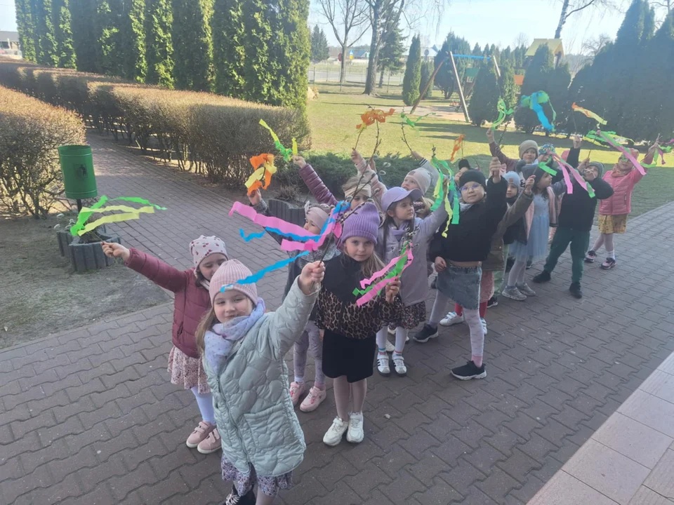 Dzieci wzięły udział w wiosennym korowodzie, maszerując wokół przedszkola. Zimę pożegnano muzycznym akcentem, a wspólna zabawa stała się okazją do świętowania nadejścia cieplejszych dni.