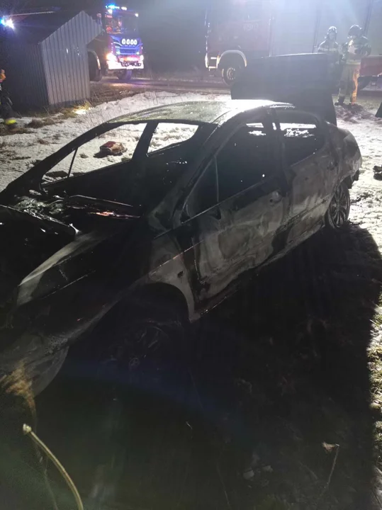 Jak się okazało, na prywatnej posesji zapalił się Peugeot. Pożar natychmiast ugaszono, ale samochodu nie udało się uratować. Spłonął doszczętnie, co widać na zdjęciach, które wykonali strażacy z OSP Okrzeja.