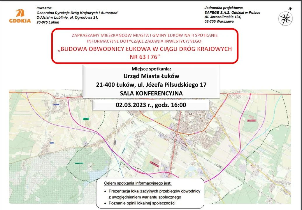 Celem spotkania jest prezentacja wariantów lokalizacyjnych przebiegów obwodnicy z uwzględnieniem wariantu społecznego oraz poznanie opinii lokalnej społeczności. Termin i miejsce spotkania informacyjnego: 2 marca, godz. 16:00, Urząd Miasta Łuków, 21-400 łuków, sala konferencyjna. W trakcie spotkania z zespołem projektowym można będzie zgłaszać opinie i uwagi do dokumentacji projektowej. Możliwe to będzie również w terminie późniejszym poprzez wysłanie wypełnionego formularza z uwagami pocztą na adres: Generalna Dyrekcja Dróg Krajowych i Autostrad Oddział w Lublinie, ul. Ogrodowa 21, 20-075 Lublin lub pocztą elektroniczną na adres: sekretariat_lublin@gddkia.gov.pl. Przesłane wnioski, podpisane i zaopatrzone w adres, zostaną przeanalizowane i w każdym przypadku udzielona zostanie odpowiedź. Termin składania wniosków mija 20 marca 2023 r.