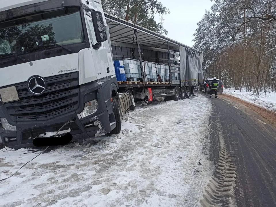 Tam ciężarówka z ładunkiem zjechała do wou. Strażacy pomogli ją rozładować z towaru i pomogli wyciągnąć z rowu.