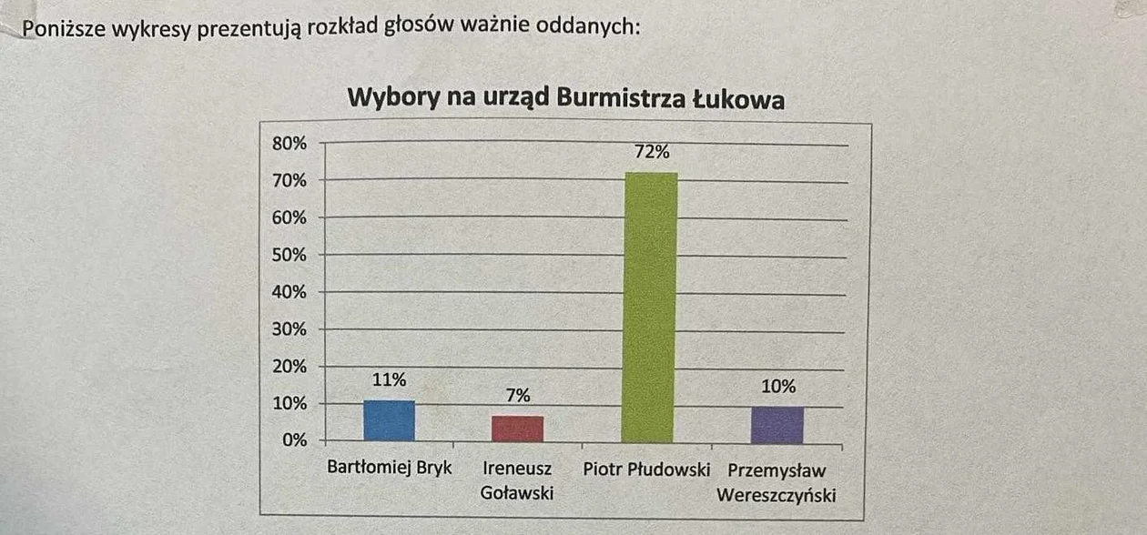 Na kolejnych miejscach znaleźli się: Bartłomiej Bryk z Prawa i Sprawiedliwości, który zdobył 11% głosów, Przemysław Wereszczyński z Przymierza dla Ziemi Łukowskiej, który uzyskał 10%, oraz Ireneusz Goławski, który zebrał 7% poparcia.