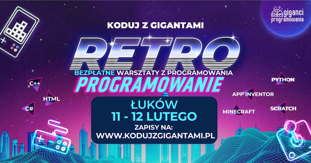 Wyruszmy razem w przeszłość śladami najpopularniejszych gier! Już 11-12 lutego w Łukowie dzieci i młodzież będą mogły wcielić się w rolę programistów sprzed lat, którzy stworzyli klasyki gier komputerowych i wideo. Okazją do tego będzie akcja “Koduj z Gigantami - Retroprogramowanie”, czyli kolejna odsłona cyklicznego wydarzenia z programowania dla dzieci i młodzieży, które organizowane jest bezpłatnie już po raz 12. W Łukowie warsztaty odbędą się stacjonarnie 11-12 lutego 2023 roku przy ul. Międzyrzeckiej 7a. Zapisy na wydarzenie możliwe są na oficjalnej stronie wydarzenia www.kodujzgigantami.pl , gdzie należy wskazać lokalizację Łuków lub pod nr tel. lokalnego organizatora 695 013 794. Liczba miejsc jest ograniczona. Dzięki wykorzystaniu wielu nowoczesnych środowisk programowania spróbujemy połączyć ze sobą świat dzieci i świat rodziców. W zajęciach, specjalnie dostosowanych do grup wiekowych, mogą wziąć udział uczniowie szkół podstawowych oraz ponadpodstawowych w wieku od 7 do 19 lat.