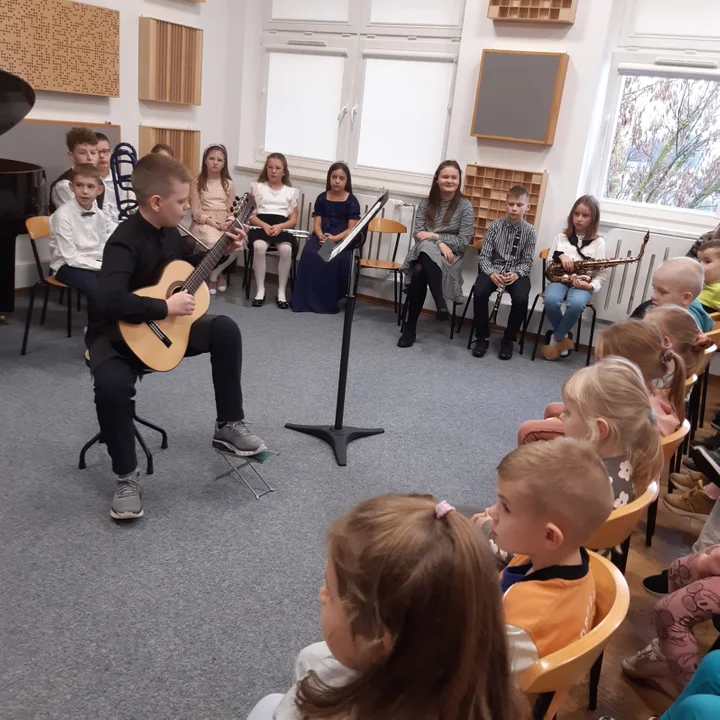 Dzieci z grup Jeżyki i Bystrzaki zapoznały się z instrumentami, na których można się uczyć grać w Szkole Muzycznej, pilnie słuchały mini koncertów swoich starszych kolegów, rozpoznawały instrumenty.