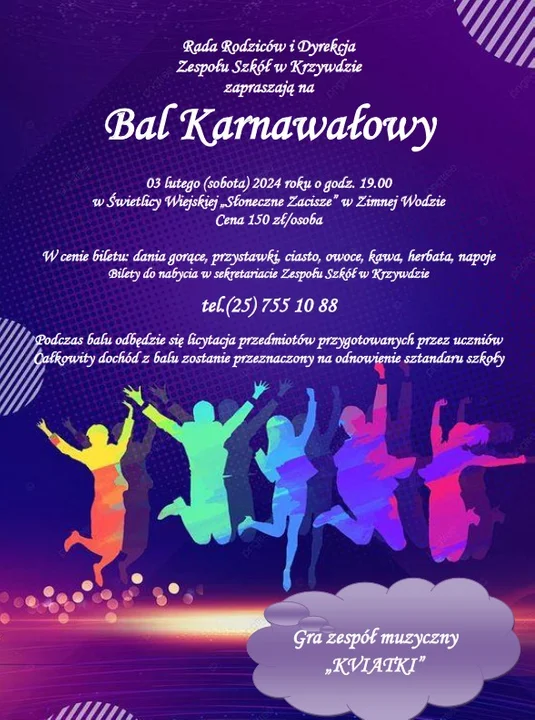W trakcie balu odbędą się licytacje prac wykonanych przez uczniów szkoły Podstawowej w Krzywdzie. Na uczestników czeka wiele innych atrakcji i niespodzianek, w tym też kulinarnych, przygotowanych specjalnie na tę okoliczność.