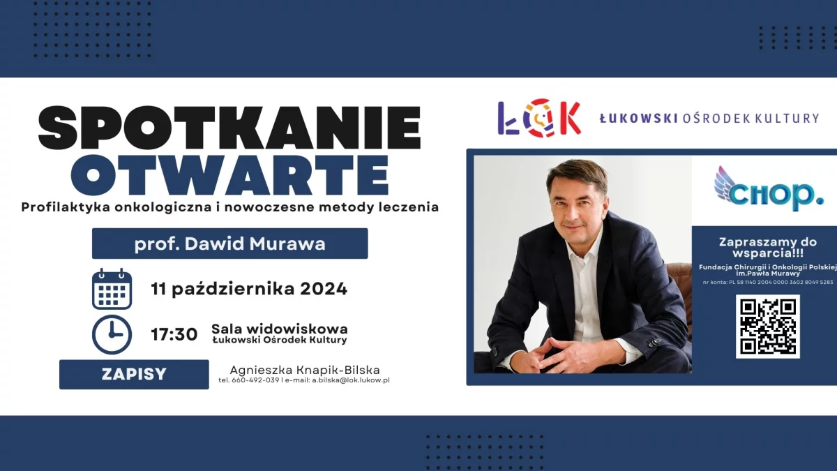 Łukowski Ośrodek Kultury i Szkoła Policealna - Medyczne Studium Zawodowe im. J. Korczaka w Łukowie zapraszają na spotkanie otwarte o profilaktyce chorób nowotworowych oraz roli, jakie te działania mają w powrocie do zdrowia: