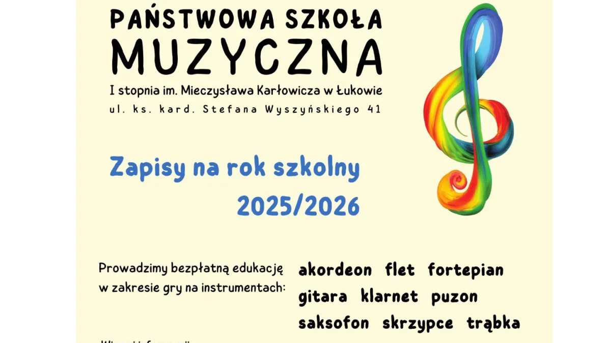 „Prowadzimy bezpłatną edukację w zakresie gry na instrumentach: akordeon, flet, fortepian, gitara, klarnet, puzon, saksofon, skrzypce, trąbka.”