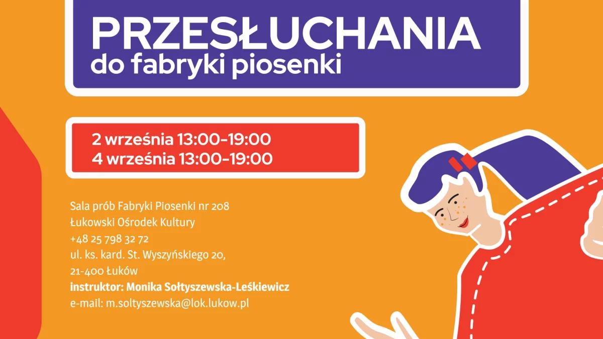 Wszelkie pytania dotyczące naboru prosimy kierować do prowadzącej Fabrykę Piosenki ŁOK – p. Moniki Sołtyszewskiej-Leśkiewicz (e-mail: m.soltyszewska@lok.lukow.pl)