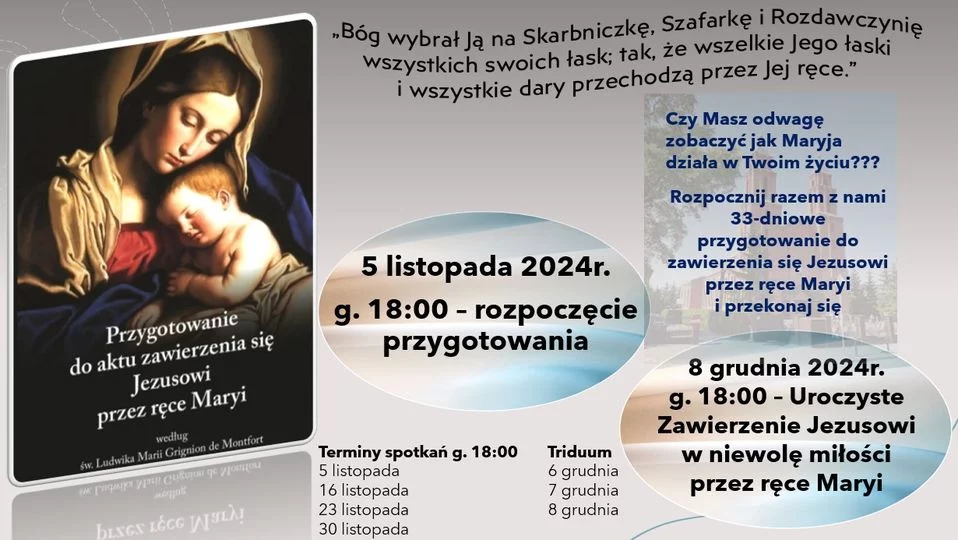 Informacje łukowskie5 listopada w parafii NMP Matki Kościoła w Łukowie rozpocznie się 33-dniowe przygotowania do zawierzenia się Jezusowi przez ręce Maryi.