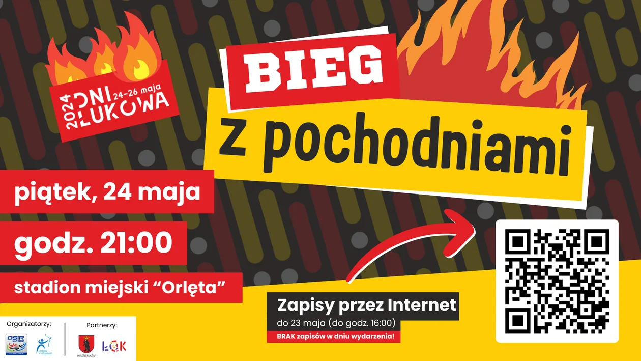 Osoby chcące wystartować w biegu inaugurującym tegoroczne Dni Łukowa, mogą zapisywać się za pośrednictwem specjalnego formularza internetowego. Formularz dostępny jest pod adresem: https://bit.ly/BiegzPochodniami2024. Zapisy trwają do czwartku 23 maja do godz. 16:00, a odbiór numerów startowych będzie możliwy w biurze OSiR (ul. Browarna 63) w godzinach pracy Ośrodka, bądź w dniu imprezy na stadionie miejskim w godz. 20:00 - 20:30.
