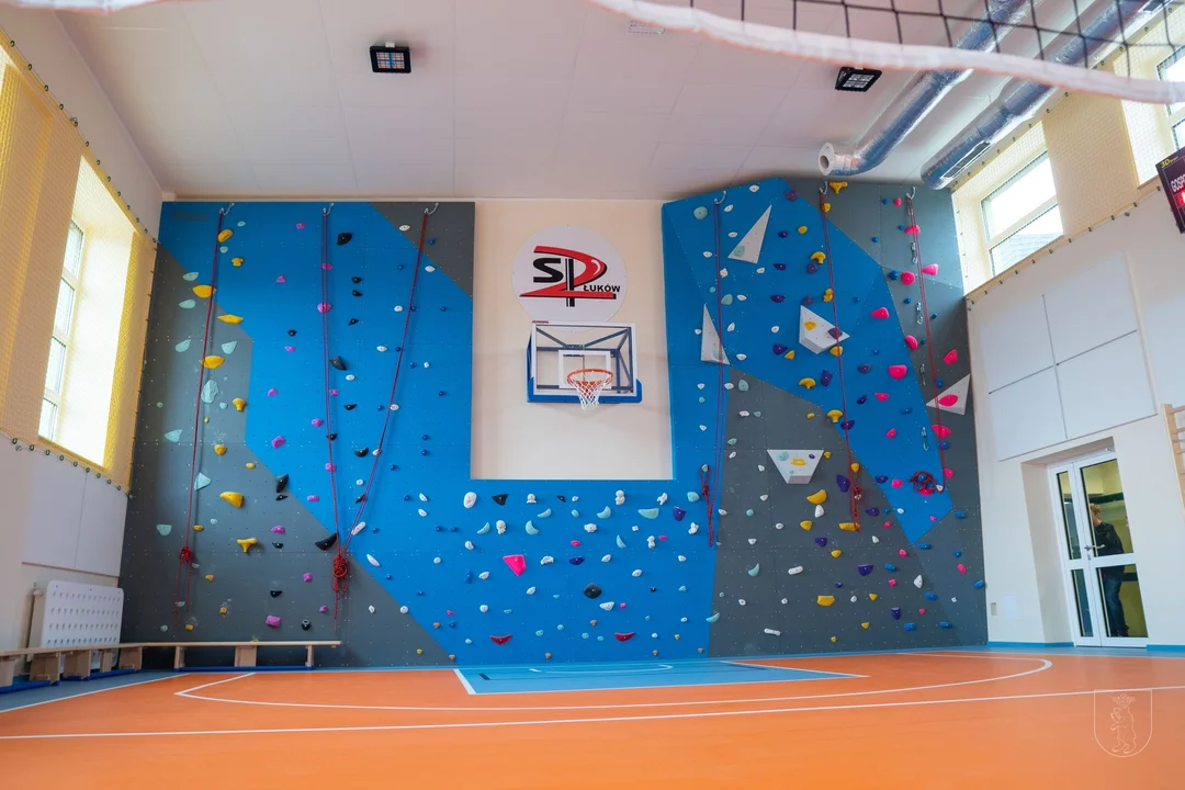 Co wykonano w ramach inwestycji? Zakres rzeczowy zadania obejmował: prace rozbiórkowe i wyburzeniowe, konstrukcję, pokrycie dachu z pracami towarzyszącymi, instalacje elektryczne, instalację wentylacji mechanicznej, instalację centralnego ogrzewania, instalację freonową, stolarkę okienną i drzwiową, elewację, wykonanie schodów zewnętrznych, wykończenie powierzchni ścian, stropów, podłoże pod podłogę sportową wraz z nawierzchnią sportową i wyposażenie (wymianę drabinek gimnastycznych, wymianę i montaż nowego osprzętu sportowego do koszykówki i siatkówki, wykonanie ścianki wspinaczkowej na ścianie szczytowej budynku).