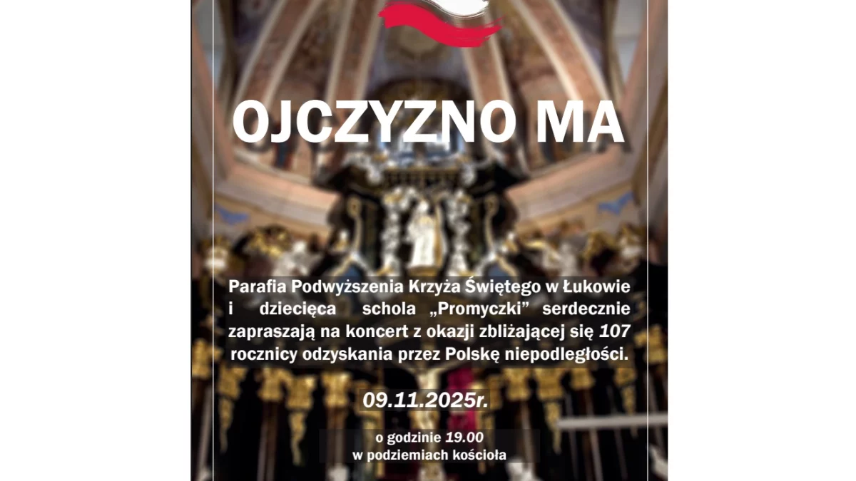 Wydarzenie zostało zorganizowane z okazji 107. rocznicy odzyskania przez Polskę niepodległości. W programie znajdą się zarówno utwory literackie, jak i muzyczne, które wprowadzą uczestników w patriotyczny nastrój i przypomną o wartościach, dzięki którym nasz kraj odzyskał wolność. Koncert będzie okazją do wspólnego przeżywania tego ważnego święta w duchu refleksji, wdzięczności i radości z bycia częścią wspólnoty narodowej. Schola „Promyczki” serdecznie zaprasza wszystkich parafian oraz gości do udziału w tym wyjątkowym wydarzeniu.