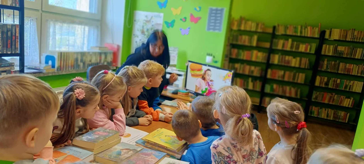 Przedszkolaki miały okazję do obejrzenia bogatego księgozbioru, dowiedziały się na czym polega praca bibliotekarza oraz jak należy korzystać z książek i jak je szanować. Największą uwagę przedszkolaków przyciągnęły książki trójwymiarowe oraz podświetlane specjalną zakładką. Dzieci dowiedziały się jak można wypożyczać książki do domu i czytać je wspólnie z rodziną. Wysłuchały też opowiadania "Jak powstaje pizza?". Na zakończenie wszyscy otrzymali słodką niespodziankę oraz kolorowankę.