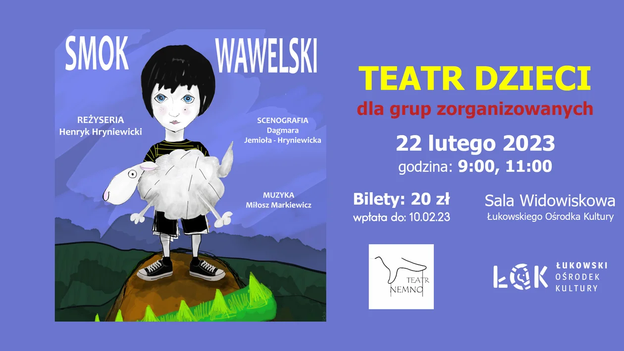 Bilety na spektakl teatralny „Smok wawelski” w cenie 20 zł są do nabycia w kasie Kina Łuków. Wpłat można dokonywać do 10 lutego. Grupy zorganizowane proszone są o kontakt z Tomaszem Kanadysem, Łukowski Ośrodek Kultury - pokój instruktorów 210, tel. 663-371-442, mail: t.kanadys@lok.lukow.pl.