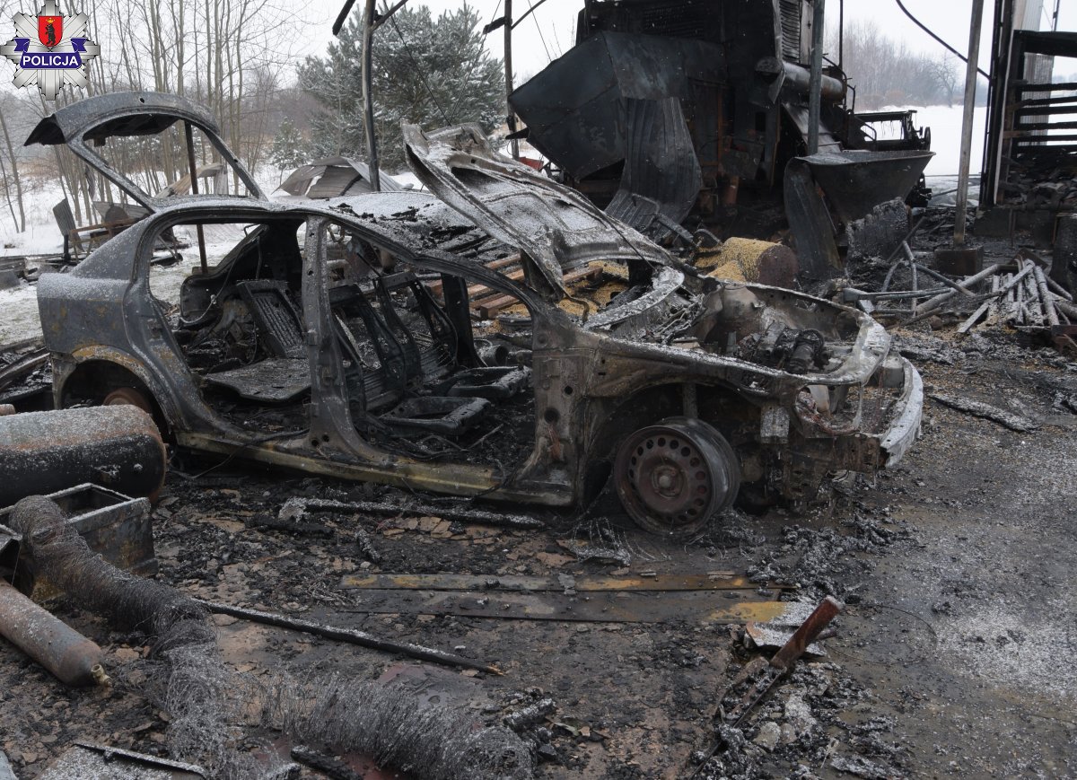 Na szczęście 24-latek zdążył uciec z garażu, jednak nie był już w stanie ugasić swego auta. Pozbawiony jednego koła płonący samochód nie mógł być wypchnięty z garażu, „zajęły” się od niego inne składowane tam przedmioty. Rozprzestrzeniający się ogień dotarł do stojącego w pobliżu innego garażu, gdzie stał kombajn zbożowy. Niestety również on uległ spaleniu. Policjanci ustalili dodatkowo, że w garażach stały jeszcze dwa motocykle, przyczepka samochodowa oraz inne urządzenia, które też się spaliły. Wstępnie straty oszacowano na kwotę przekraczającą 90 tysięcy złotych.